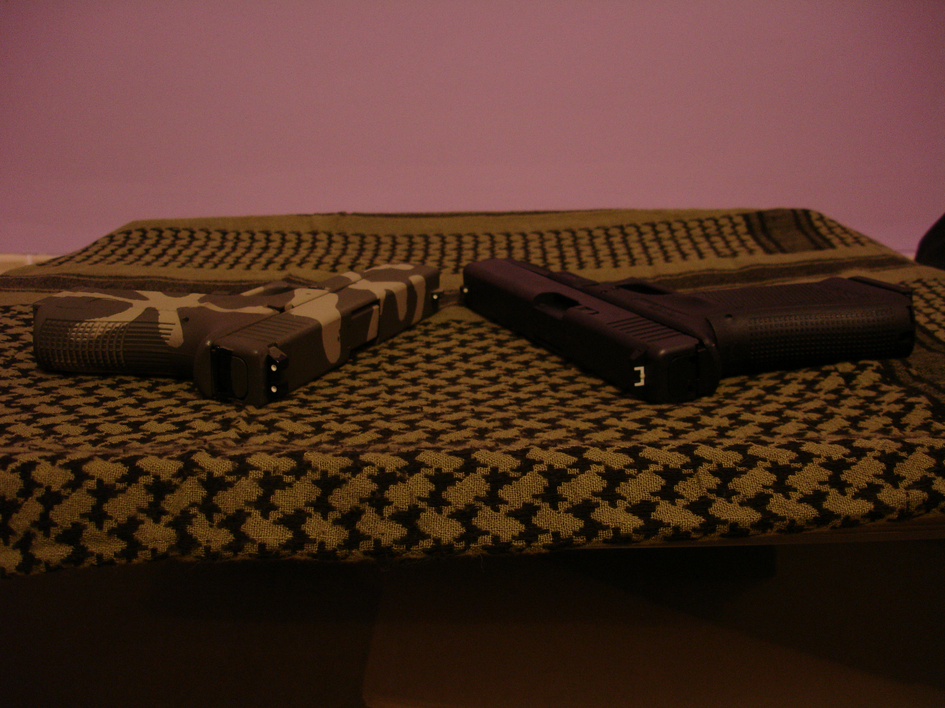 Izquierda: pistola airsoft KJW G23 sin Nitesiters. Derecha: pistola G17 Gen4 con Nitesiters sin fotoluminiscencia (no han sido iluminados previamente)